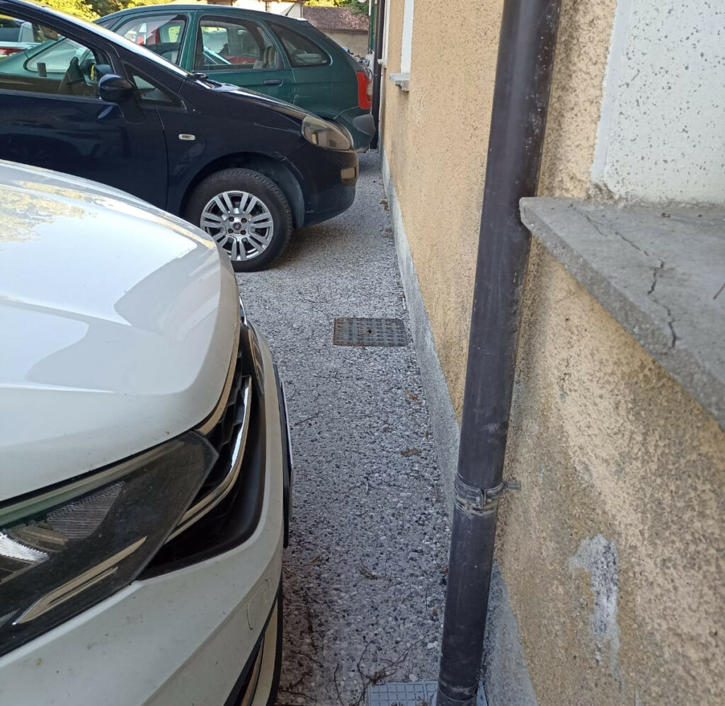 Al posto del piccolo marciapiede e della zona di parcheggio che poteva accogliere gli ospiti c’è una larga colata di cemento, delimitata da paletti fissi incastrati malamente. Il tutto con la creazione di importanti ristagni dopo ogni temporale.